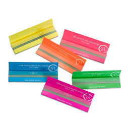 Papeles ultrafinos de arroz en cinco colores distintos: verde, blanco, rosa, marrón y azul en cada librito. Libritos con colores vibrantes y 32 hojas por unidad de 130 mm x 54 mm.